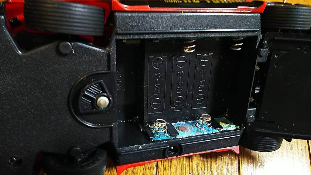 基盤は特に故障してなさそうですが、車体の電池BOXには青い錆が多いので、やはりこれはホビラジ化する方が良さそうです。ちなみに、このシリーズは送信機内部の接触不良で動かない事もあるようです。