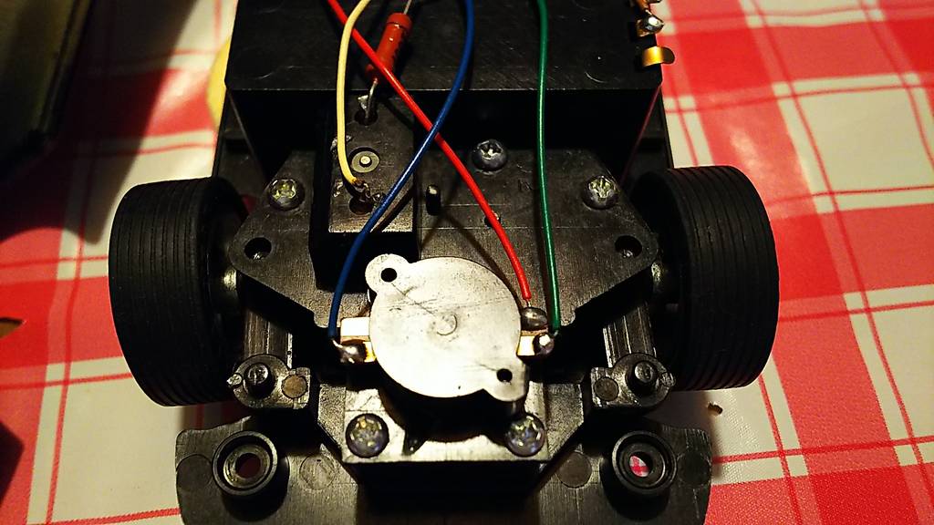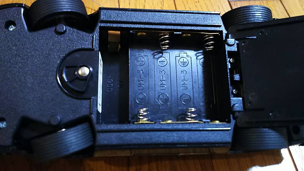 早速、車体に(単3電池4本+角形1本)電池を入れてみると、一応何とか動いてくれましたが、ステアリングが片方だけ上手く曲がらない時があるようでした。例によってシャーシ裏にはステアリング微調整トリムは無く、恐らく内部にポテンショメータ付でしょうね。