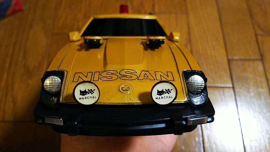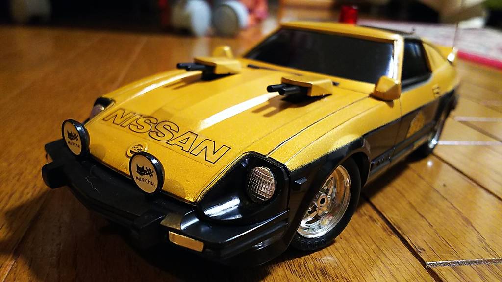 前後のサスペンションやデフギアも無く、玩具寄りのトイラジですが、プロポーションは悪くなく、車高も低めです。前方のフォグランプが何故か上側に付いていますね。