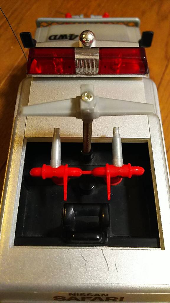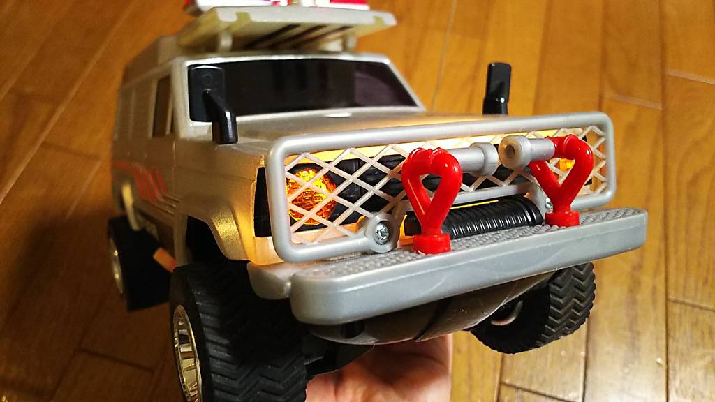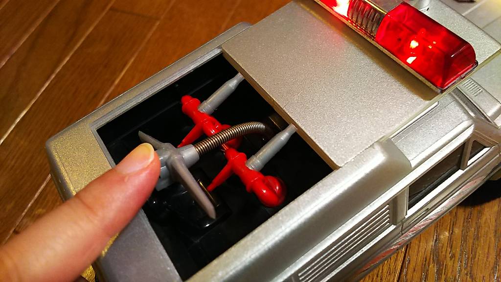 この車両の特徴はルーフが前方にスライドし、中から2門の放水銃やレーダーカメラが搭載された座席がせり上がる点でして、このトイラジではその座席の下にバネが仕込んであり、ルーフをスライドさせるとボヨンとせり上がる仕組みになっています。