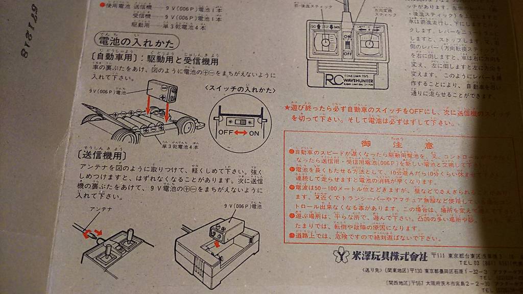 車体電源は受信用に角型9Vが一本、走行用に単3乾電池が四本必要で、いずれも現代のアルカリ乾電池でも大丈夫なようです。送信機にも角型9Vが一本必要で、早速電池を入れて動作確認してみる事に…。