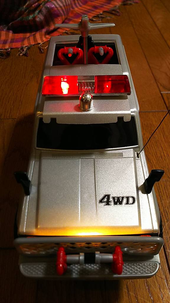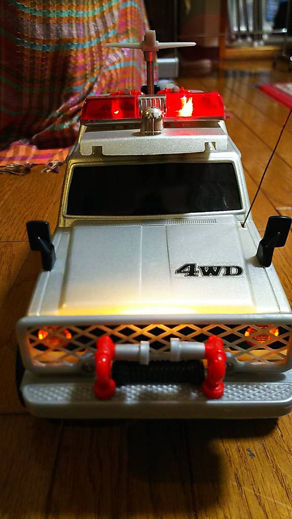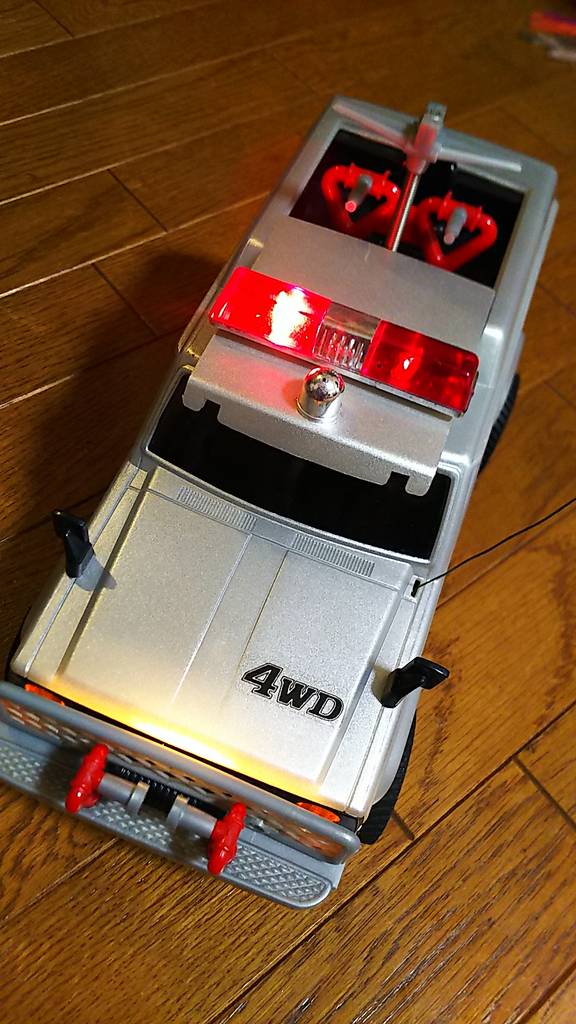 ラジコンの機能としては停止付の前後左右フルアクションとルーフ上の回転灯が点滅するくらいで、前後のライトは残念ながらメッキパーツとなっています。箱書きにある「超再生4chトーン式」と言うのが良く分かりませんが、オンオフ操作の送信機です。