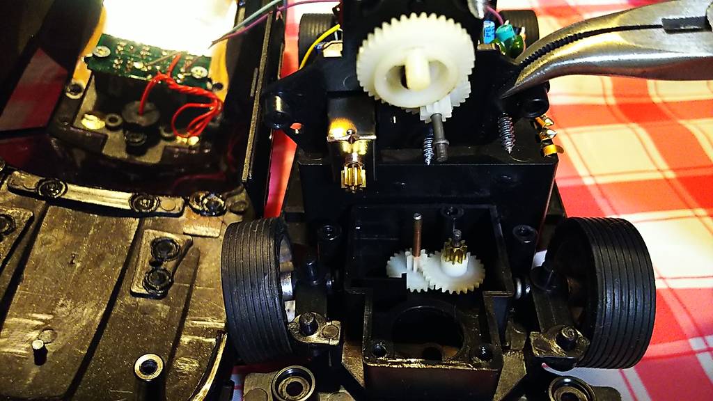基本的にはスーパーZと内部構造は同じで、前後のモーターは通電させると可動しました。リアギアBOX内はピニオンギア他オール金属製で、ステアリングにはポテンショメータ付でした。