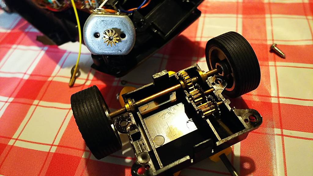 とりあえず内部構造を確認してみましたが、配線切れは無く、前後のモーターも通電させると問題なく動きました。リアモーターはマブチモーターですが平形130より少々大きめ。ピニオンギアは12Tで2枚の中間ギアも含めて全て真鍮製?のオール金属製ギアでした。