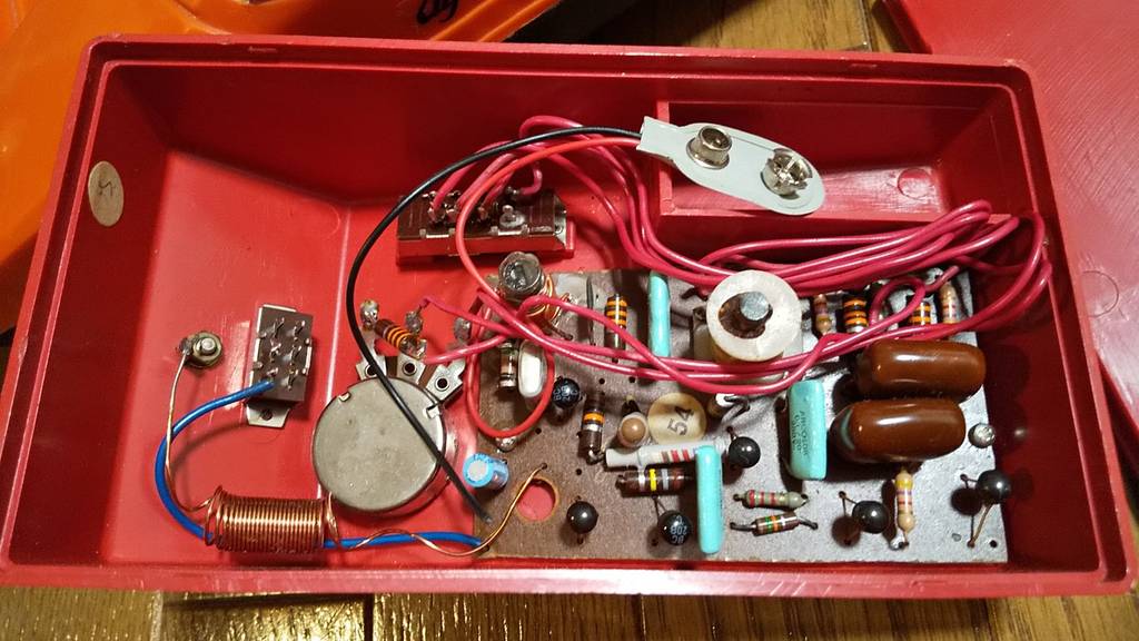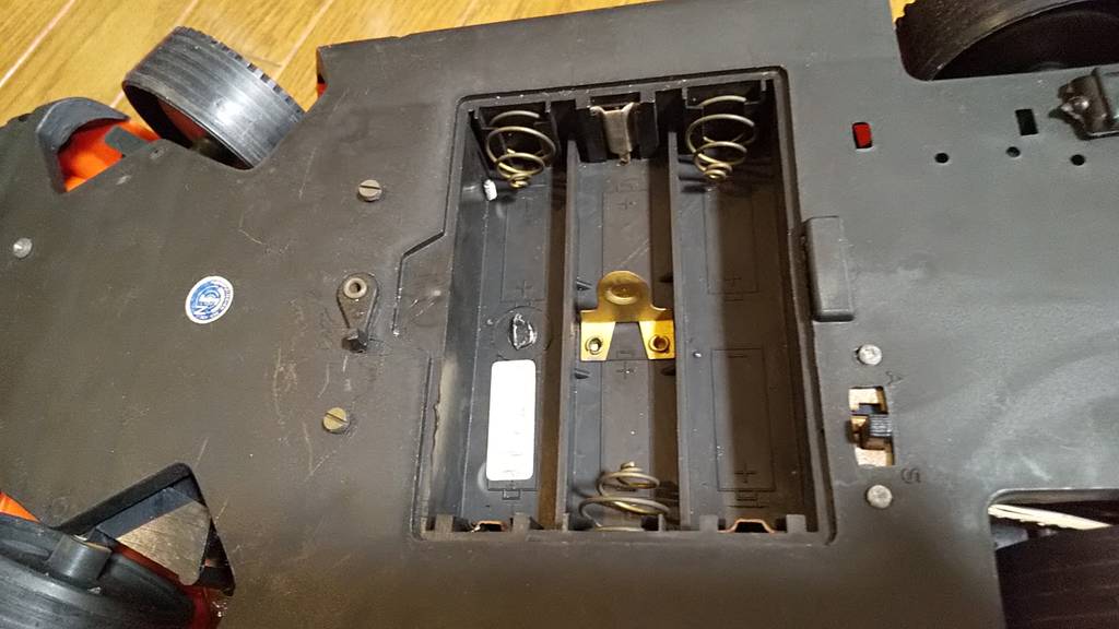 車体電源はカリブ同様 単3六本で、オンオフ操作の送信機の電極はサビが酷く、送信機を分解して通電させてみました。とりあえずラジコン操作してみましたが全く反応なし…仕方なくボディーを開けてみると…。