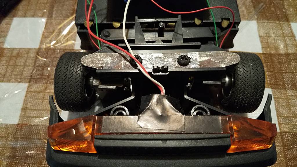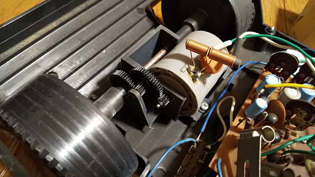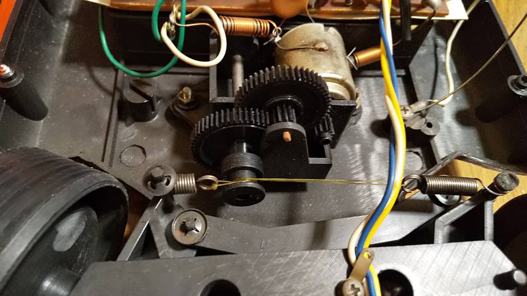 中間ギアはカリブから拝借し、リアモーターに通電させるとリアタイヤが動きました。マブチ丸型260サイズのリアモーターはカリブ同様とても綺麗で問題なし。元の所有者は独自に故障を修理したようですが、何故かギアが足りなかったり配線の一部が切除されていました。
