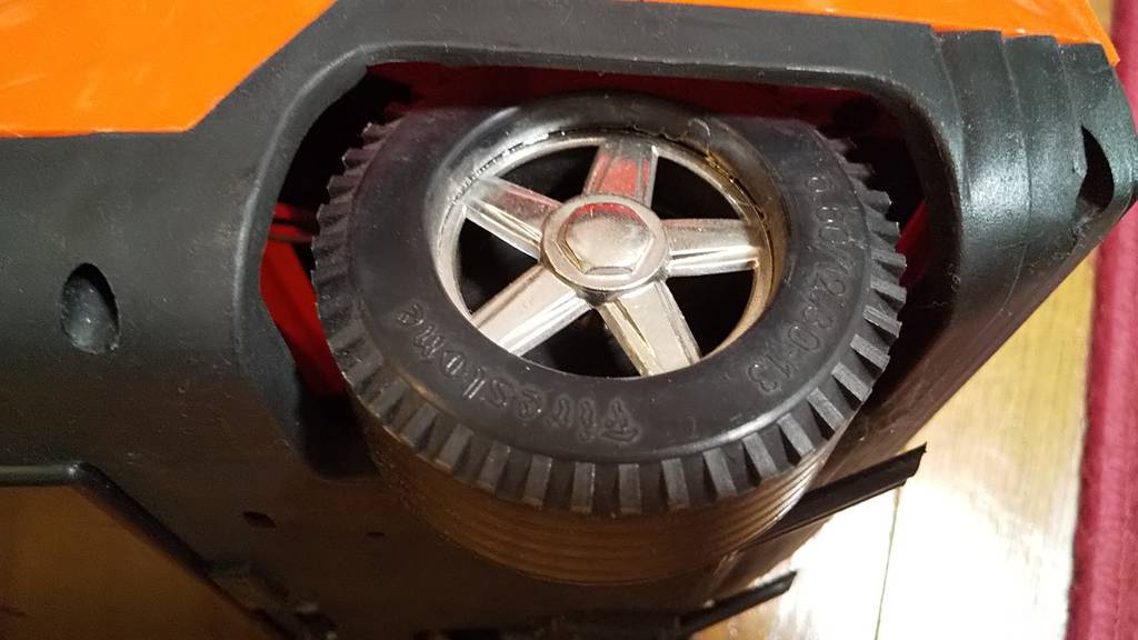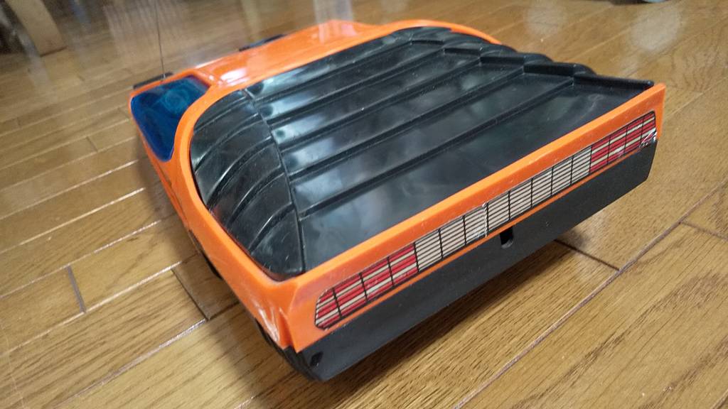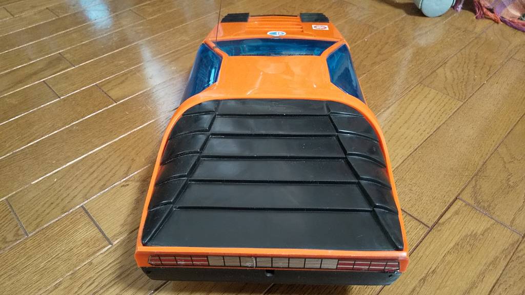 カラボの鮮やかなオレンジ色のボディーは以前のランチャ同様ポリバケツのような弾性のあるプラスチックで出来ていて割れは無いようでした。車体電源は単2乾電池が六本必要で、送信機には角形9Vが一本でした。