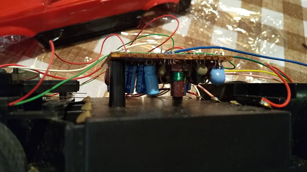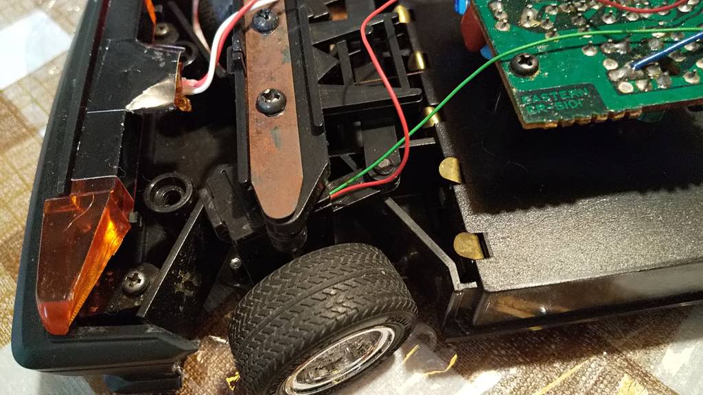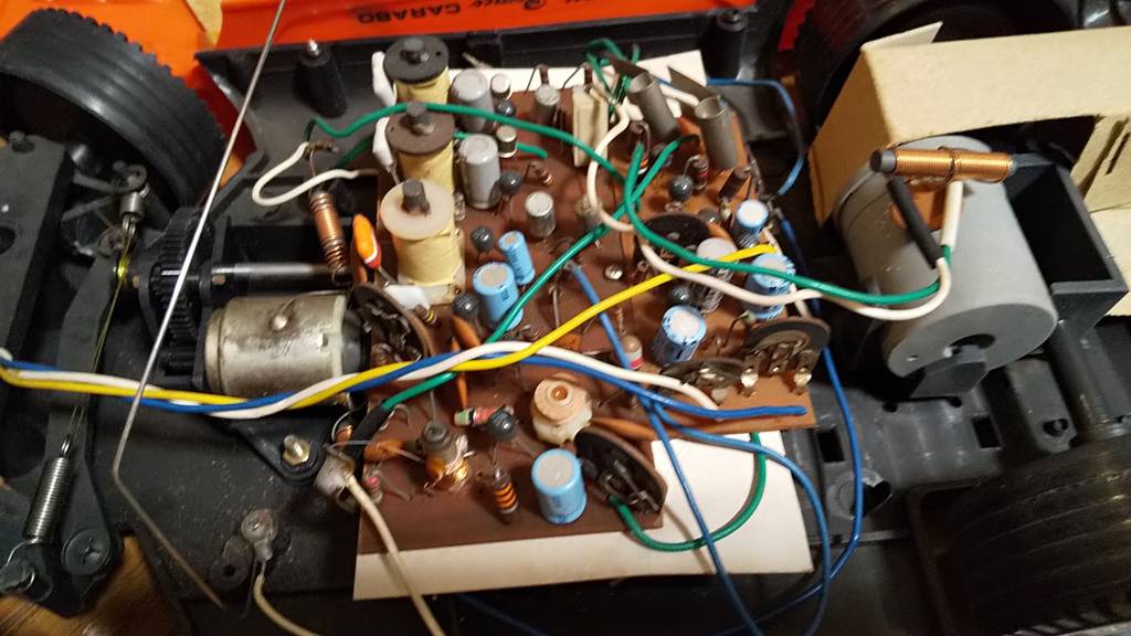 両方とも通電させると動きましたが、送信機の操作には全く反応しませんでした。古い基板には可変抵抗が幾つかあり、その内の二つを慎重に回してみるとステアリングの反応が有りましたが上手く調整出来る物ではありませんでした。*もしかしたら電源スイッチの接触不良?!