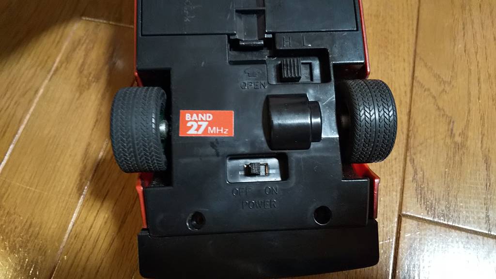 車体電源は単3乾電池6本で、とりあえず電池を入れて電源を入れてみると一瞬リアタイヤが回り、ヘッドライトも点灯しました!こういう反応が有れば通常ならばラジコン操作も可能なはずです。