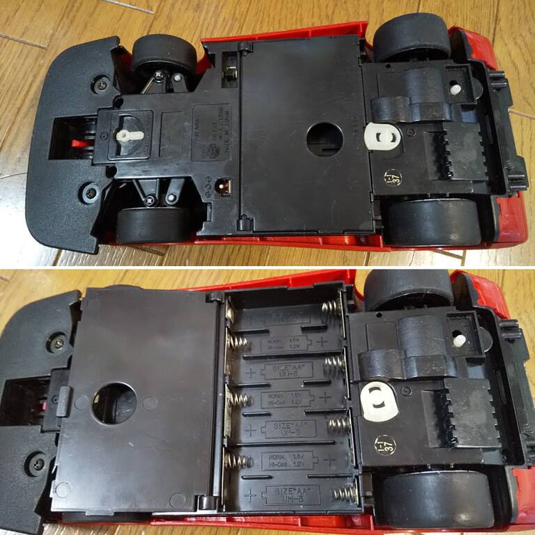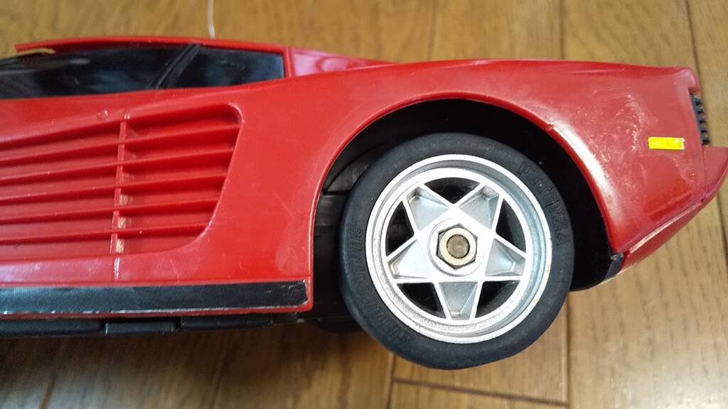 今回は社名が朝日通商の頃の物なので、実車のテスタロッサが販売された1984年から朝日コーポレーションと社名が変わる1989年までに発売された商品だと思われます。見た目は綺麗に見えますが玩具としては中々の年代物ですね。