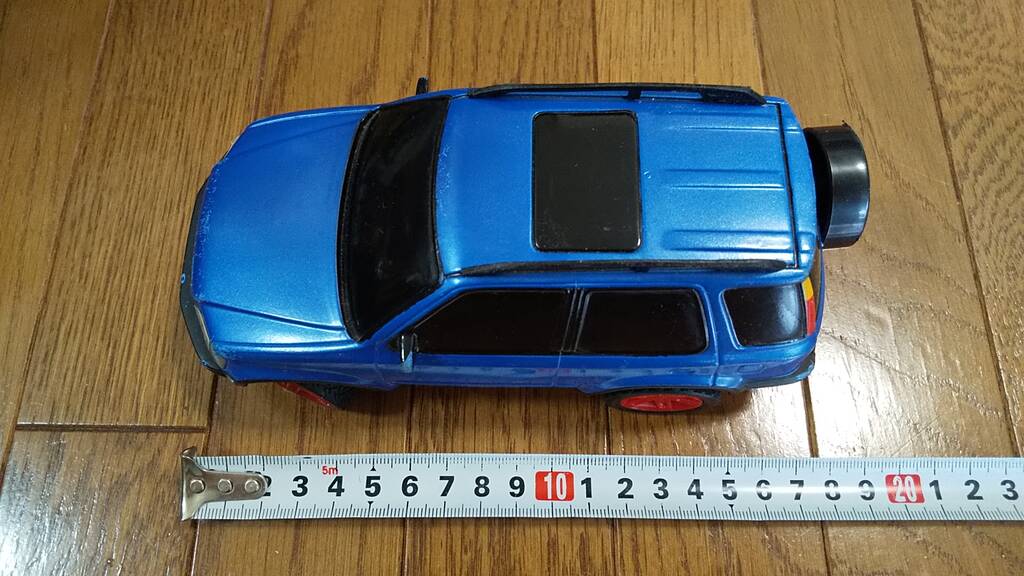 1/24scale 全長18cmの車体は擦り傷や塗装剥がれが目立ちますが別パーツのルーフレールも破損せずに残っていました。駆動は四駆ではなく後輪二駆で、主な機能はギア切替くらいでしょうか。車体アンテナはインナーアンテナとなっています。