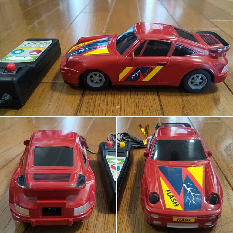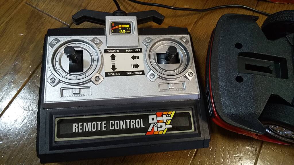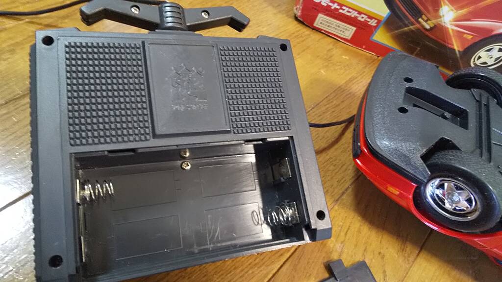 箱には色褪せや破れがあり、車体も一見綺麗に見えますが良く見るとフロントガラス等に焼きゴテを当てたような溶けた傷が有りました。リモコンの割に送信機は立派な作りで、有線コードは130cmもあり広範囲で操作出来るようです。