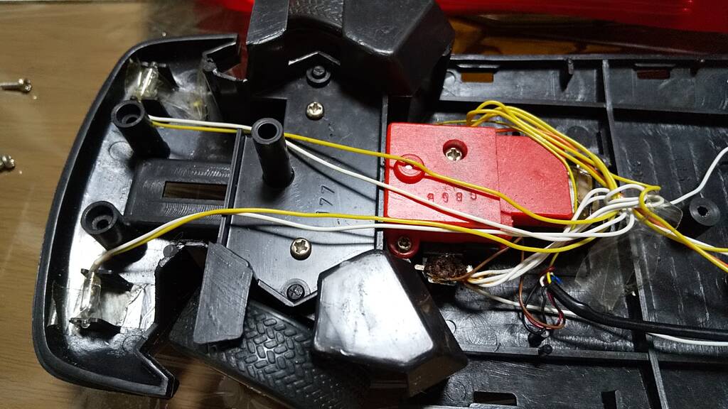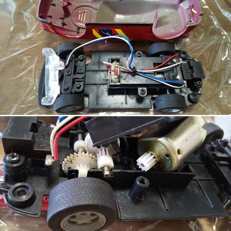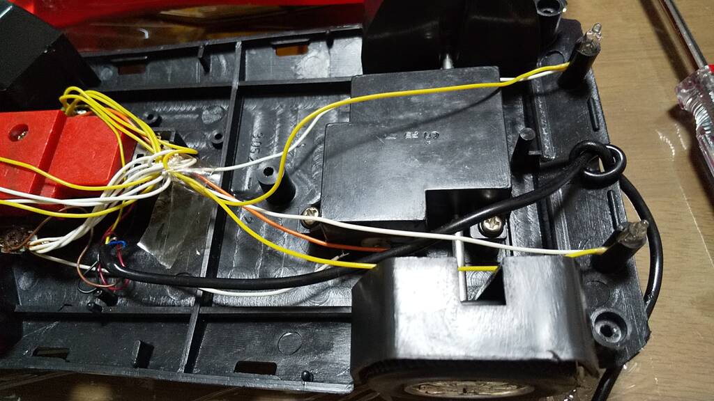 内部を確認してみると↑ステアリングの周辺に僅かに断線が見られましたが、それが何処に付いていたコードなのか分かりませんでした。一応操作は出来るので無理に修理せず、清掃と前後の平形130モーターの注油のみとしました。