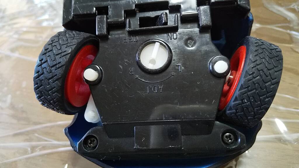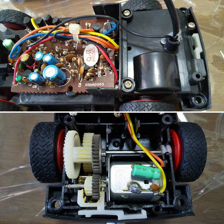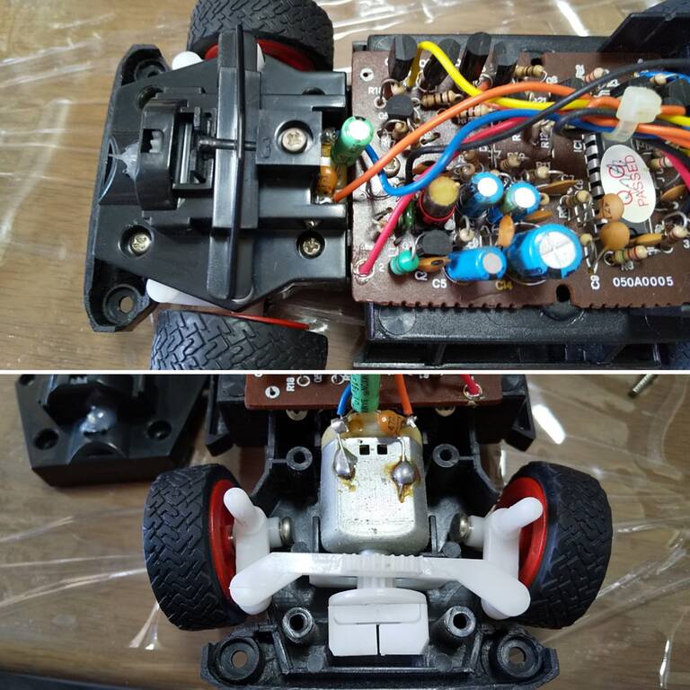 元の操作法はAM27MHzのオンオフ式でステアリングは走行中のみ操舵可能。二段ギア切替付でサスやデフは有りませんが、ホビラジ化する時に前輪にサスを付与出来そう。元々グリップの良い中空スリックタイヤは劣化していてツルツルだったりヒビ割れしていました。