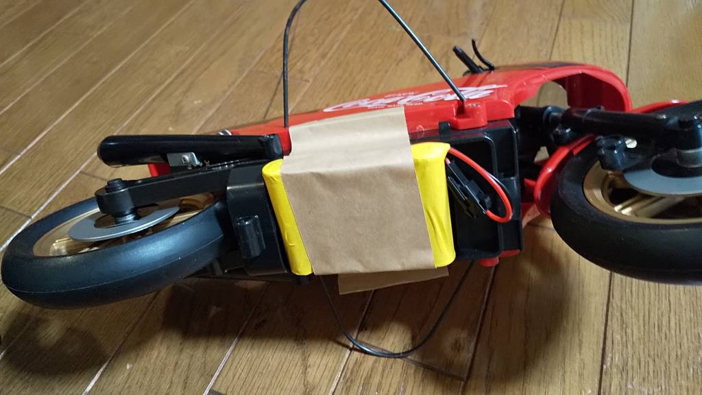 バイクを倒した状態で操作してみましたが、やはり走行用のバッテリー電圧が足りないようでした。次回は試しに9V乾電池を走行用に繋いでみようかと思いますが、どちらにせよ狭い室内では走行は難しそうな大きさでした。